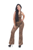 Młody model w garniturze z odciskiem lamparta na białym