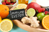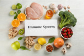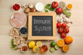 Wzmocnij swój układ odpornościowy odpowiednią dietą. Różne artykuły spożywcze na drewnianym stole, układanie płaskie
