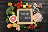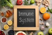 Układ immunologiczny wzmacniający z prawidłowym odżywianiem. Różne produkty spożywcze i talerz łupkowy, układanie płaskie