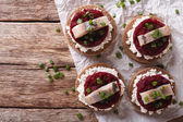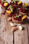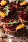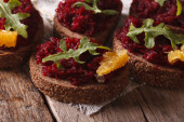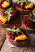 chleb z buraczków, pomarańcze i posiłek. Widok z góry pionowy