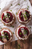 Canape z buraków, pomarańcze i rukoli z bliska. Pionowe