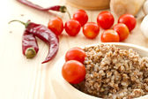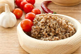 Zbożowe Kasza gryczana w misce na drewnianym stole