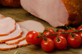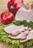 Plasterki szynki z zieloną sałatą, cebulą i pomidorami