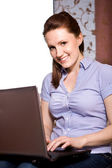 kobieta z laptopa siedząc na kanapie uśmiechający się