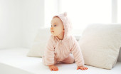 Słodkie dziecko w domu w białym pokoju stoi blisko okna