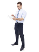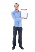 młody przystojny mężczyzna arabski pisanie czegoś w schowku izolować