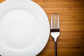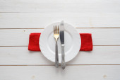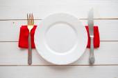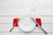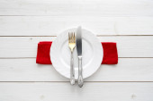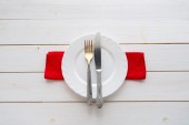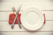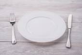 Nóż, widelec i danie nad drewnianym stole