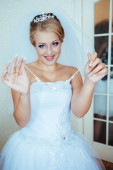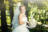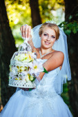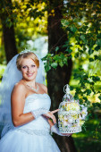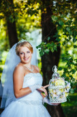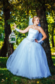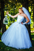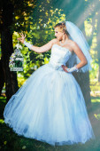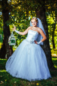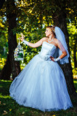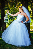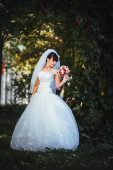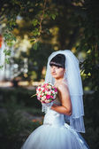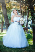 Pięknej narzeczonej pozowanie odkryty w parku w dniu ślubu