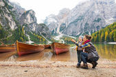 Kobieta turysta z rękami w kieszeniach spoczywa na jezioro Bries