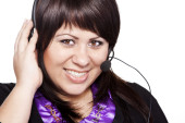 kobieta operatora z zestawu słuchawkowego, prezentując swój produkt