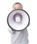 Chłopak krzyczy do dużych megafon białej