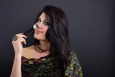 Piękna Brunetka stosuje makijaż w jasnych ubraniach