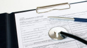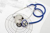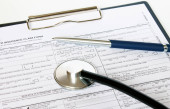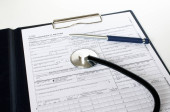Formie recepty i stetoskop na biurku lekarza