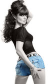 piękna dziewczyna z doskonałej skóry czarna koszula i jeansy z czarnym shor