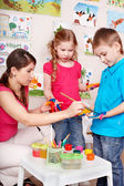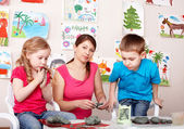 Grupa dzieci i nauczyciel formy z gliny w sali zabaw.