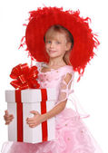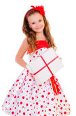 urodziny dziecko dziewczynka w czerwonej sukience z pudełko.