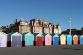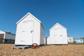 Kolorowych plażowe ustawieni wzdłuż plaży z tradycyjną architekturą za, pod jasne, Błękitne niebo.