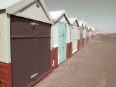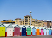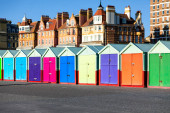 Zdjęcie "Kolorowych plażowe ustawieni wzdłuż plaży z tradycyjną architekturą za, pod jasne, Błękitne niebo." może być wykorzystywane do celów osobistych i komercyjnych zgodnie z warunkami zakupionej licencji Royalty-free. Obraz jest dostępny do pobrania w jakości wysokiej rozdzielczości do 5760x3840.