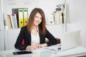 Kobieta sukcesu w biznesie z tabletem w ręku patrząc pewny siebie i uśmiechnięta