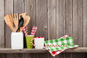 Kuchnia, naczynia do gotowania na drewnianym stole