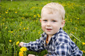 Ładny chłopiec siedzi na trawnik z mniszek lekarski
