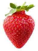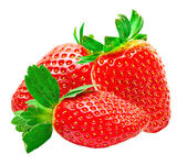 Truskawka z liśćmi Ścieżki. Dojrzały cały owoc truskawki i pół izolowany na białym tle ze ścieżką wycinania. truskawkowe owoce makro studio zdjęcie