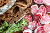 Plastry saucisson, jamon i basturma na deski drewniane