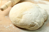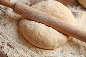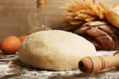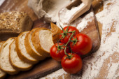 Ciasto na deska do krojenia z wiśni na stole z bliska