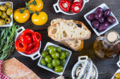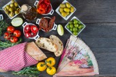 Wybór autentycznych hiszpańskie tapas na drewnianym stole z góry