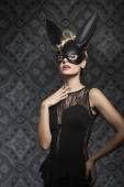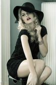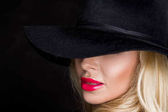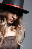 portret dziewczyny moda z czarny kapelusz, patrząc na kamery