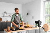 Zdjęcie "Młody człowiek kroi pomidory na hamburgera w kuchni" może być wykorzystywane do celów osobistych i komercyjnych zgodnie z warunkami zakupionej licencji Royalty-free. Obraz jest dostępny do pobrania w jakości wysokiej rozdzielczości do 5760x3840.