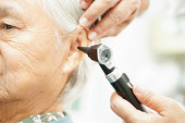 Audiolog lub lekarz laryngolog używają otoskopu sprawdzającego ucho azjatyckiej starszej pacjentki leczącej problemy ze słuchem.
