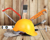 Żółty kask z tworzyw sztucznych bezpieczeństwa i narzędzia
