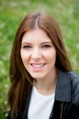 Dziewczynka kobiece studentów poza w parku słuchanie muzyki na headph