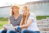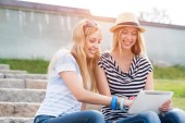 Młode kobiety, picia kawy i przeglądania Internetu na tabletkę p