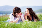Młode kobiety picie kawy w parku i szepcząc tajemnice na