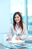 portret zbliżenie ładny kobieta siedząc w kawiarni i podpisanie dokumentu