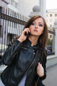Młode piękne dziewczyny w beżowy płaszcz, rozmowa przez telefon, siedząc