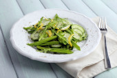Zielona sałatka z ogórka, rukolą i cytryna skórka na drewnianym stole, widok z góry