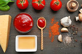 składniki do gotowania pizza na drewnianym stole, widok z góry