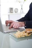 Mężczyzna jedzenie kanapka i gospodarstwa notatnik