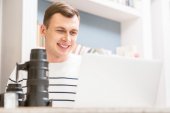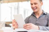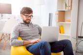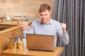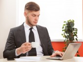 Biznesmen stały filiżanki kawy przy użyciu komputera