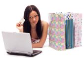 piękny, młody, rudy kobieta z torby na zakupy kolor jedy