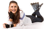 kłamstwo tyłek młoda kobieta na białym tle