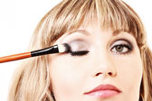 piękna młoda kobieta blondynka stosowania tuszu do rzęs na jej rzęsy