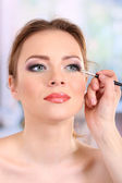 piękna młoda kobieta blondynka stosowania tuszu do rzęs na jej rzęsy