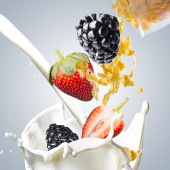 smaczne płatki kukurydziane, owoców i mleka w szklanej misce