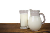 dzban i szkła z mlekiem na czerwonym tle