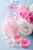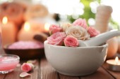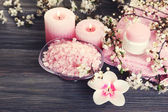 Ręka z butelki istocie i miskę wody spa zapach na drewnianym stole, zbliżenie