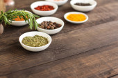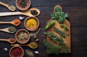Przyprawy i zioła na drewnianym stole. Widok z góry